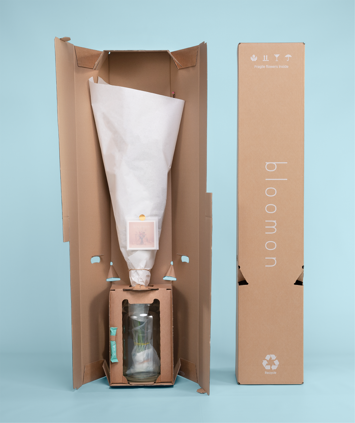 Het versturen van een extra groot bloomon-boeket in dezelfde doos als de bijbehorende vaas is al moeilijk genoeg, zou je zeggen. Maar bloomon had een nog ambitieuzer plan. De online bloemist vroeg Paardekooper, expert op het gebied van duurzaam verpakken, om een verzendbox te ontwerpen die noppenfolie ter bescherming van de vaas overbodig maakt. Missie volbracht.